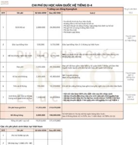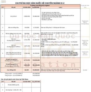 Tuy nhiên, để phụ huynh và học sinh có cơ sở tham khảo, dưới đây là bảng chi phí dự kiến Hệ tiếng D-4 và Hệ chuyên ngành D-2 của Trường Cao đẳng Kyungbuk, giúp dễ dàng hình dung và chuẩn bị kế hoạch tài chính phù hợp.